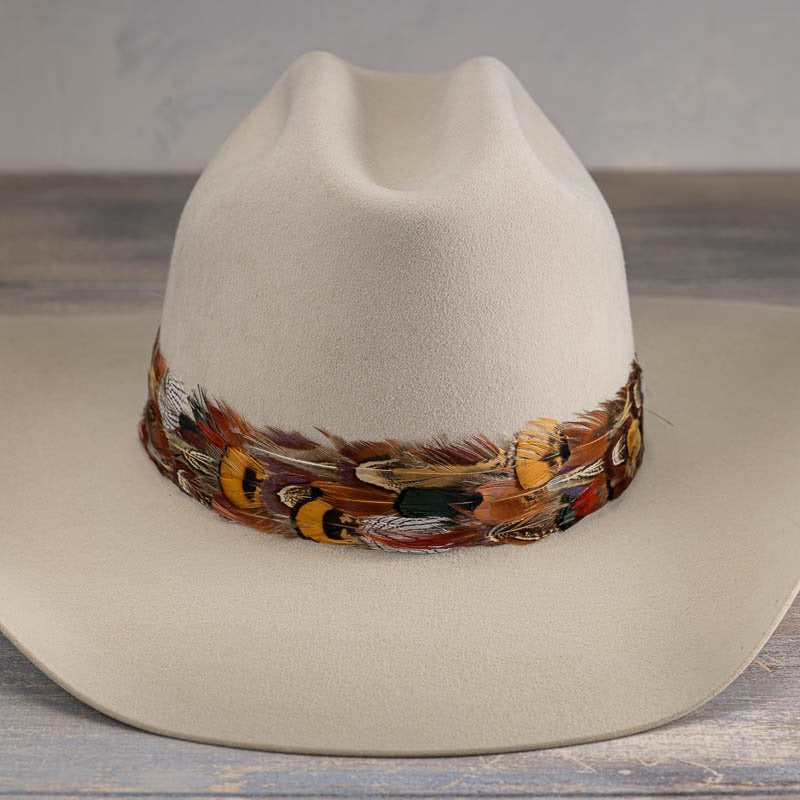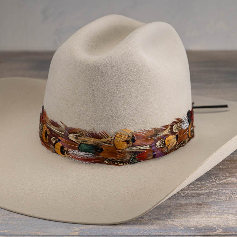 Vistoso II features a rich mix of layered feathers in warm, earthy tones, creating a bold yet balanced accent for any western hat.