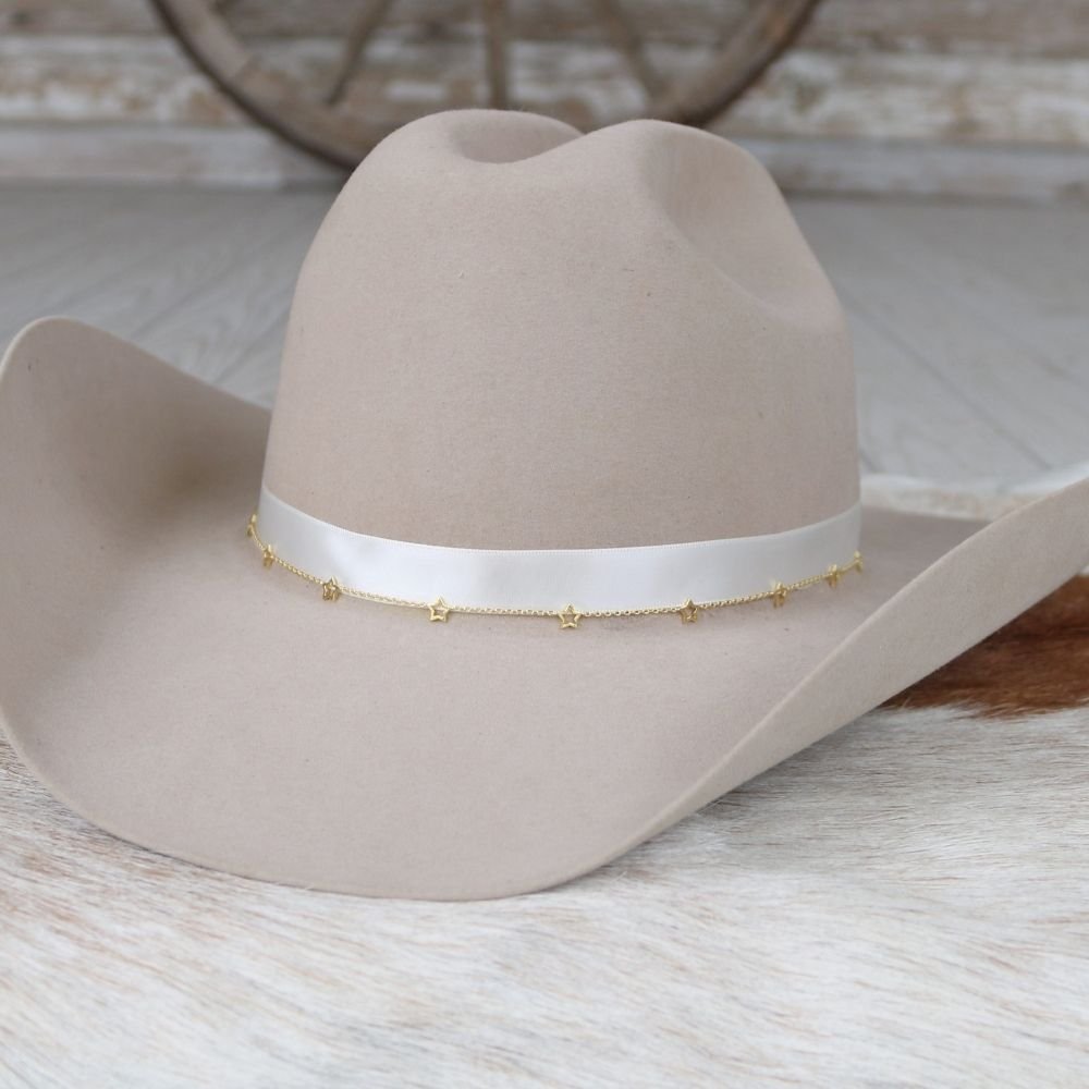 The 14K Gold Plated Star Chain Hat Band is a lightweight accent featuring small star-shaped links along a fine chain. Made with 14K gold plating over brassl, it’s designed to layer effortlessly with other hat bands while adding a subtle, eye-catching detail.