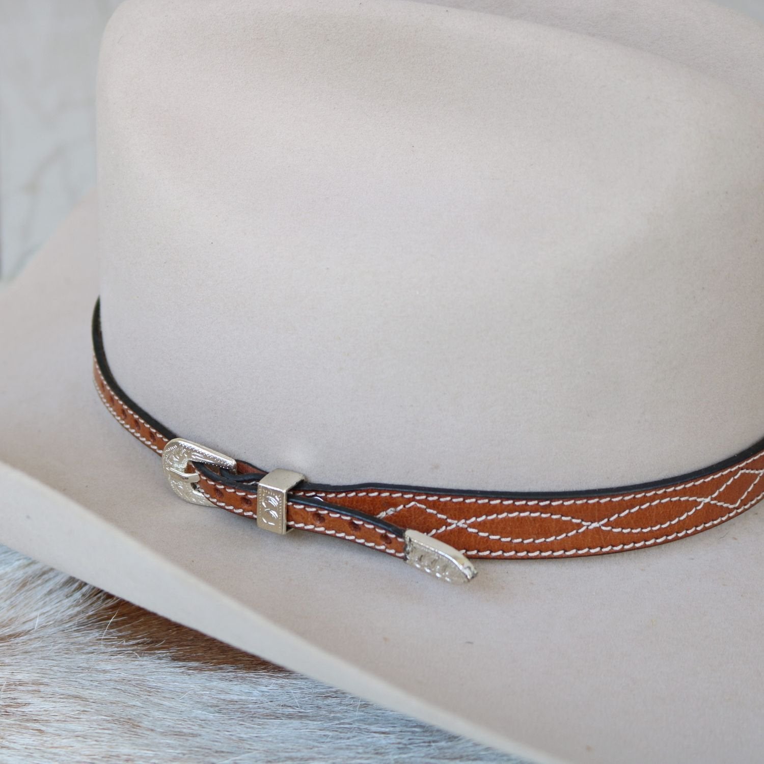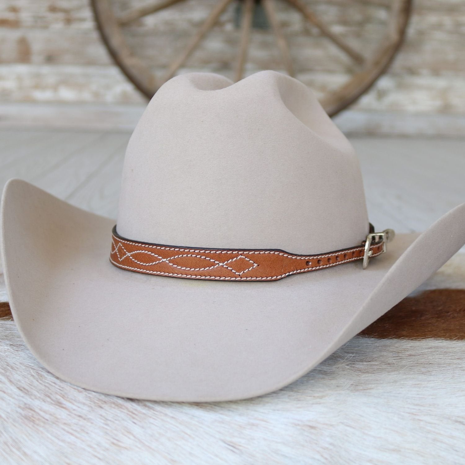 This leather hat band features a classic boot stitch pattern in white thread over warm tan leather. Clean and simple, it's finished with black edging and an adjustable silver-tone buckle set for a custom fit. Designed to complement most adult cowboy hats and felt hats.
