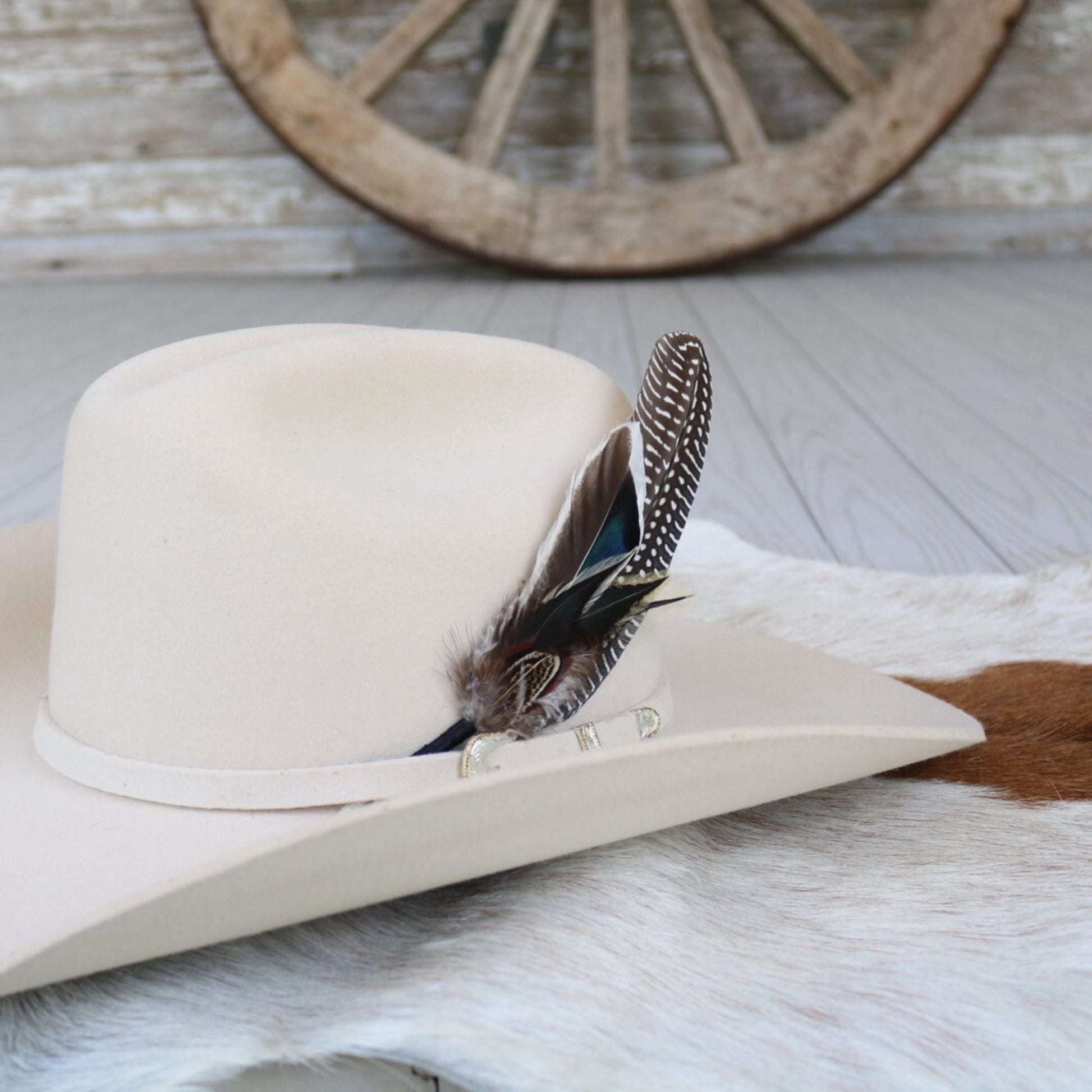 Elevate your hat game with this feather accent, featuring natural guinea and iridescent duck feathers. Finished with a ribbon on the tail, it tucks neatly into any hat band for a secure fit. Perfect for adding personality to your favorite hat—hat not included. Make a statement with this unique accessory!