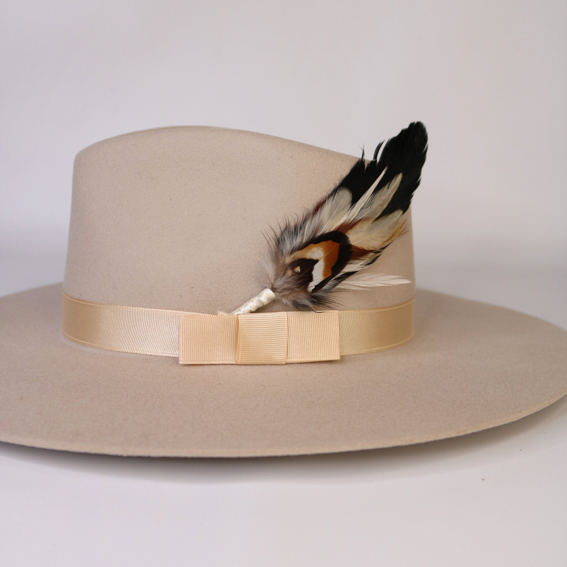 This handmade arrangement of feathers is the perfect way to set your hat apart from the rest. Simply tuck into the band of any hat. Made with a mix of pheasant, goose, and rooster feathers. Approximately 7 inches long, sizes may vary due to being made with natural materials.