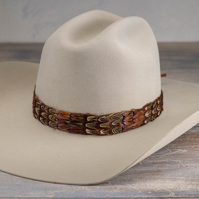 Rich brown feathers and natural patterning create a layered, dimensional look. The texture and depth make it an easy statement piece for both light and dark hats.